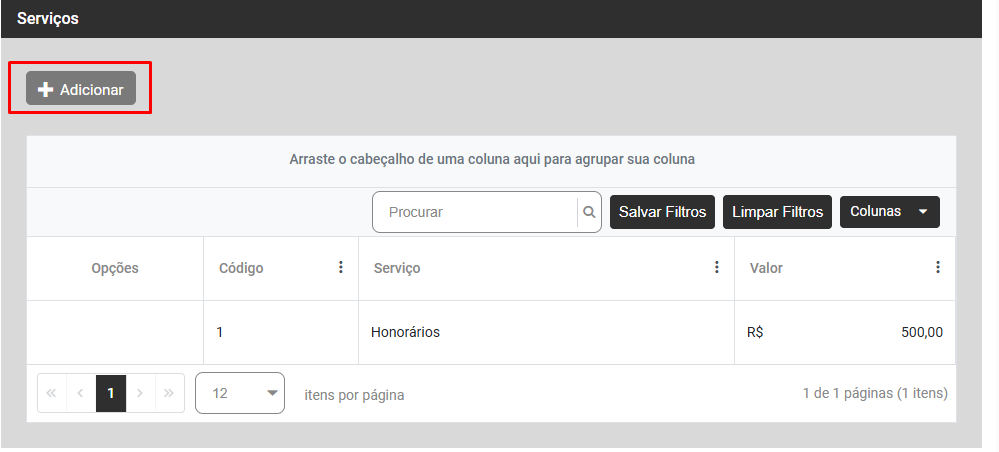 Botão Adicionar para que você informe todos os Serviços prestados para esse Cliente