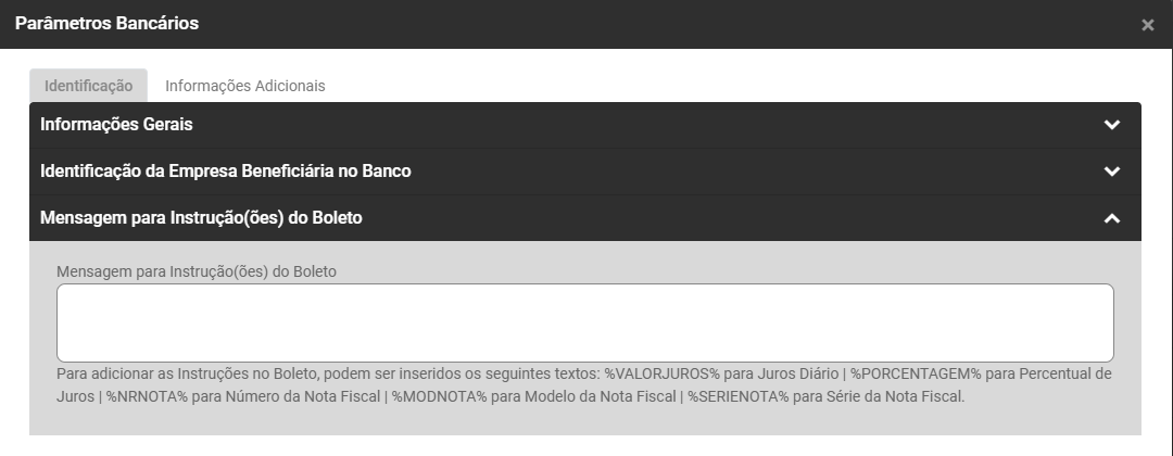 - Mensagem para Instruções do Boleto - Na parte inferior você encontrar expressões que serão substituídas no momento da geração do Boleto Bancário