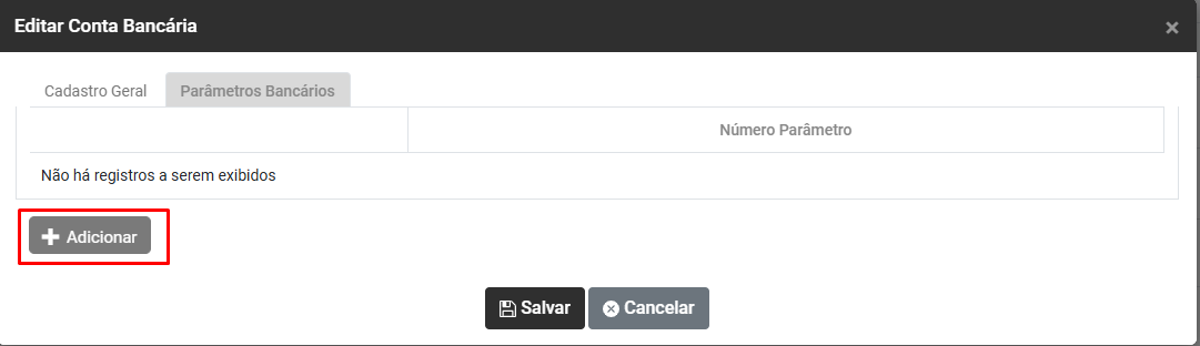 Ao clicar no botão Adicionar será apresentada a tela para Cadastrar Contas Bancárias