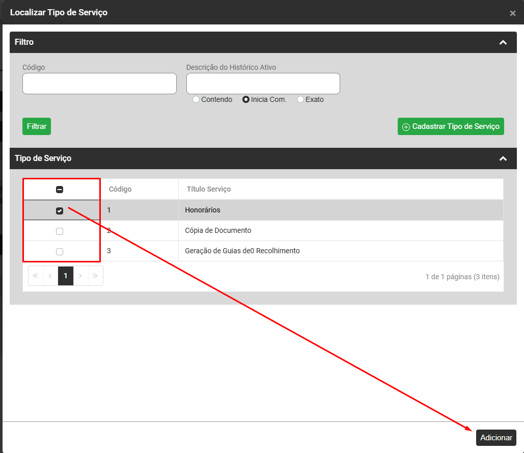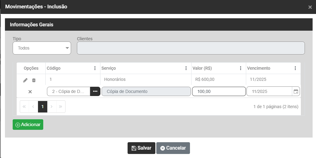 Observação - Se houver necessidade de adicionar novos Serviços, bastará clicar novamente no botão Adicionar