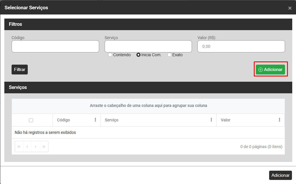 Ao clicar no botão Adicionar o Sistema irá apresentar a tela para que você cadastre as informações dos novos Serviços