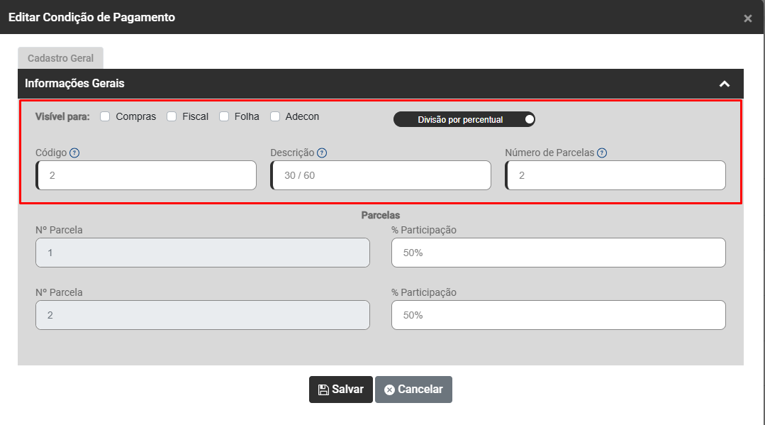 - Quais os Sistema que irão visualizar a Condição de Pagamento que está sendo cadastrada (compras, fiscal, folha e adecon)