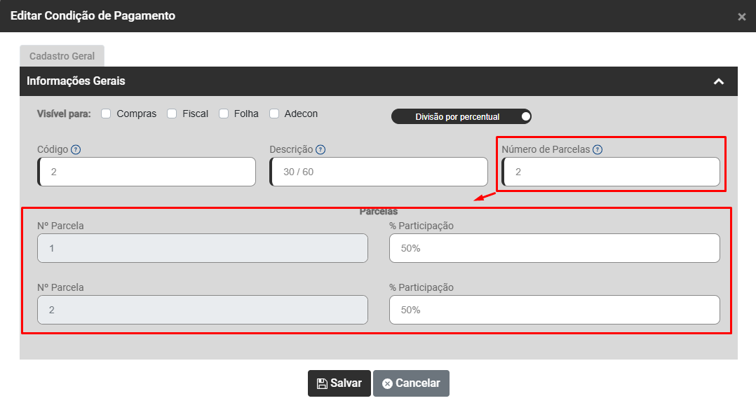 - Divisão em Percentual - Ao ser definido o Sistema irá habilitar na parte inferior da tela os campos para determinação do % de participação
