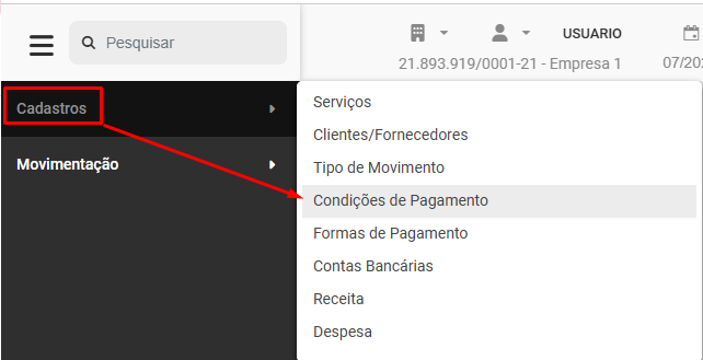 Para cadastrar as Condições de Pagamento você deverá acessar o menu Cadastros>Condições de Pagamento