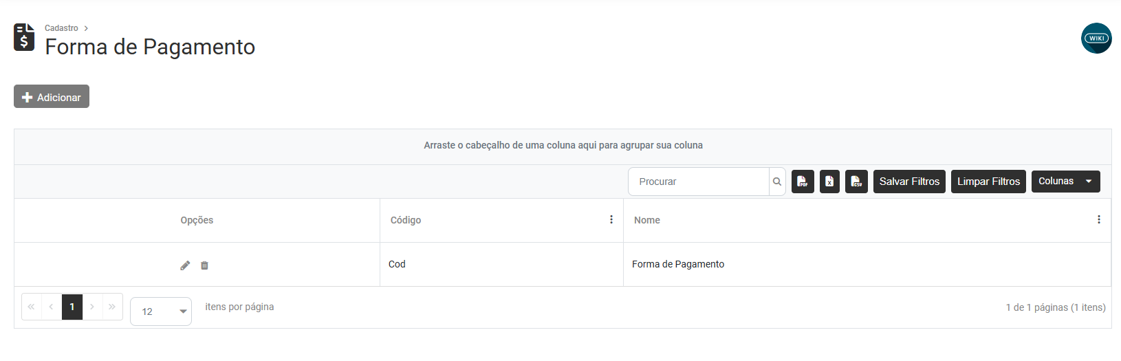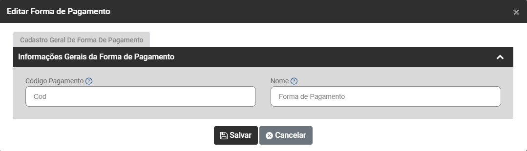 Ao clicar no botão Adicionar o Sistema irá apresenta a tela para Cadastro da Forma de Pagamento e você deverá informar: