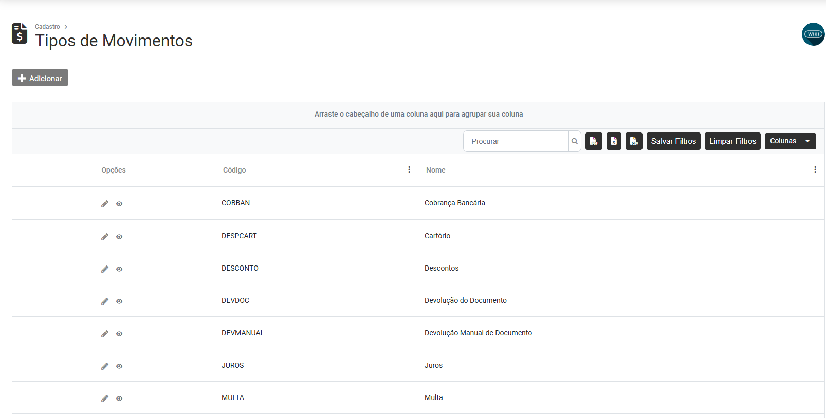 Para Editar ou Visualizar os Tipos de Movimentos do Escritório Contábil, acesse o menu Cadastros>Tipo de Movimento