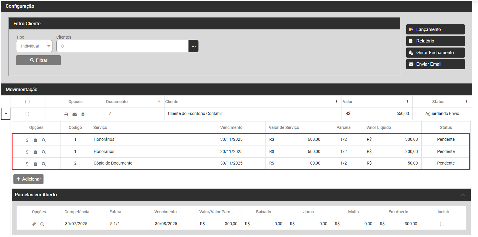 O Sistema já possui o valor dos honorários dos clientes e dos valores que ele deverá pagar para o escritório mensalmente (´padrões), esse cadastro você conseguirá visualizar no cadastro do cliente