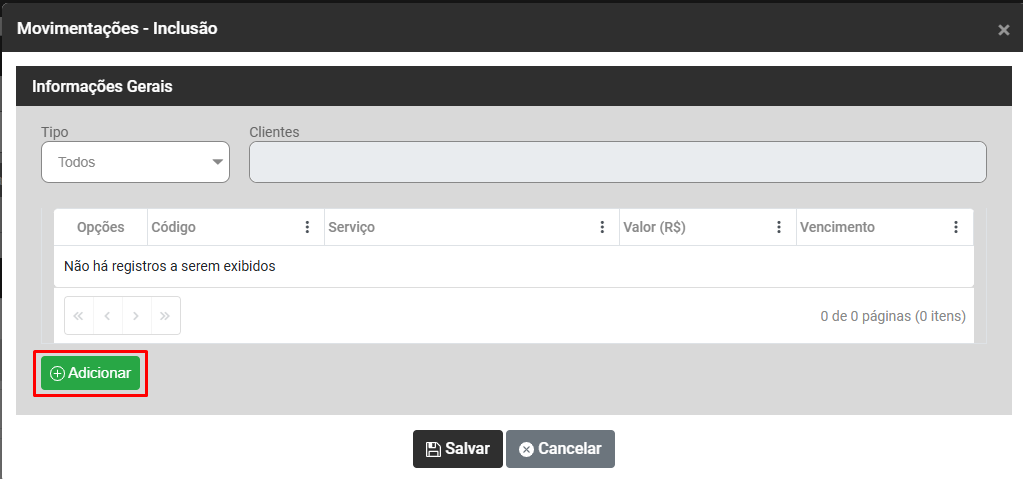Observação - Se houver necessidade de adicionar novos Serviços, bastará clicar novamente no botão Adicionar