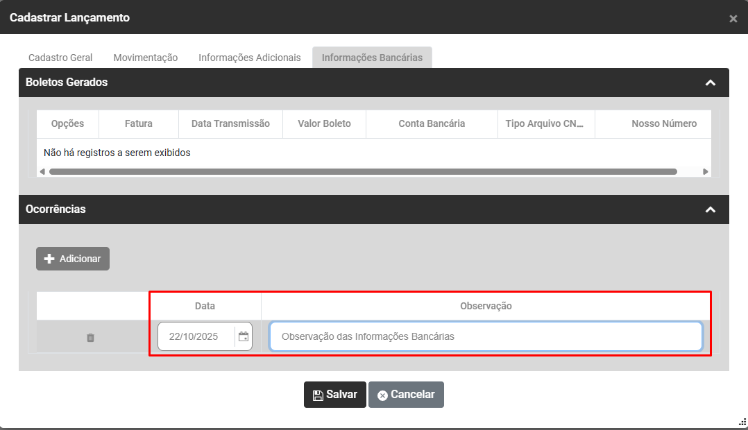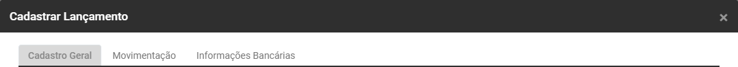 Ao clicar no botão Adicionar, será apresentada a tela para Cadastro de Lançamento, contendo 3 abas - Cadastro Geral, Movimentação e Informações Bancárias