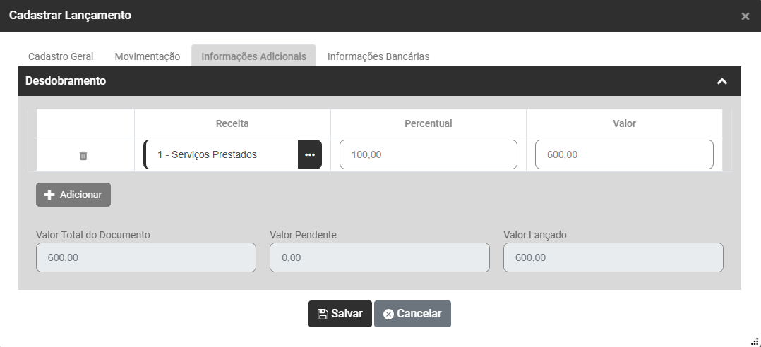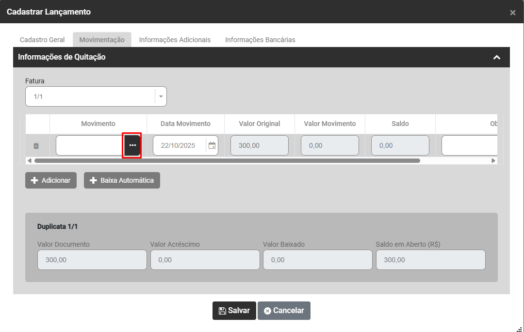Se for necessário realizar uma nova movimentação bastará clicar novamente no botão Adicionar e realizar o mesmo procedimento.