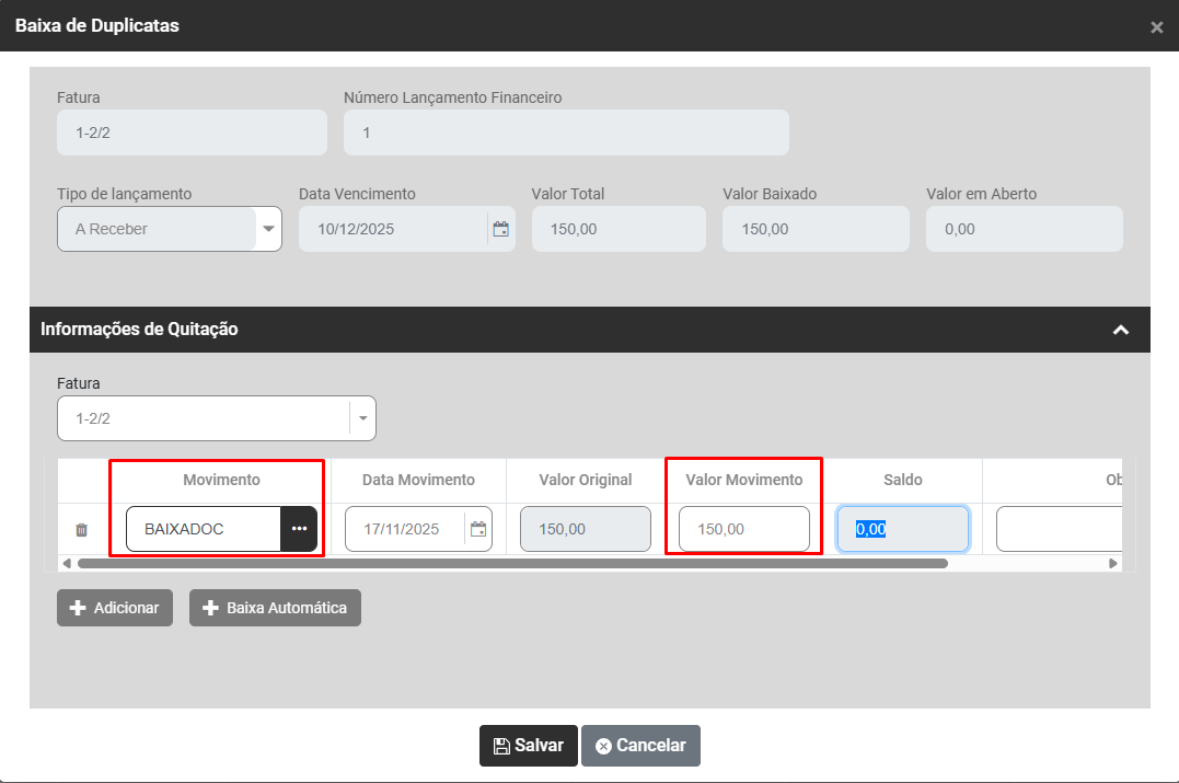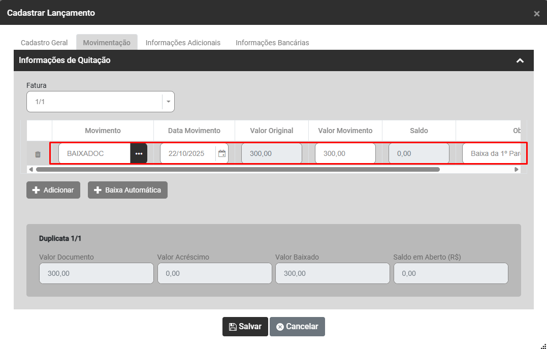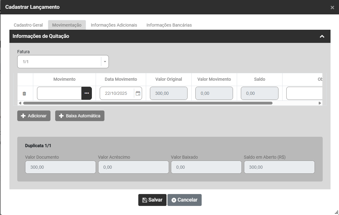 Ao clicar no botão Baixa Automática o Sistema trará automaticamente as informações da aba Cadastro Geral/Parcelamentos e você deverá preencher as informações de Movimento, conferir a data do movimento, valor do movimento e observações