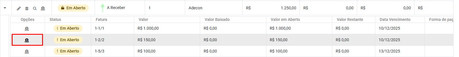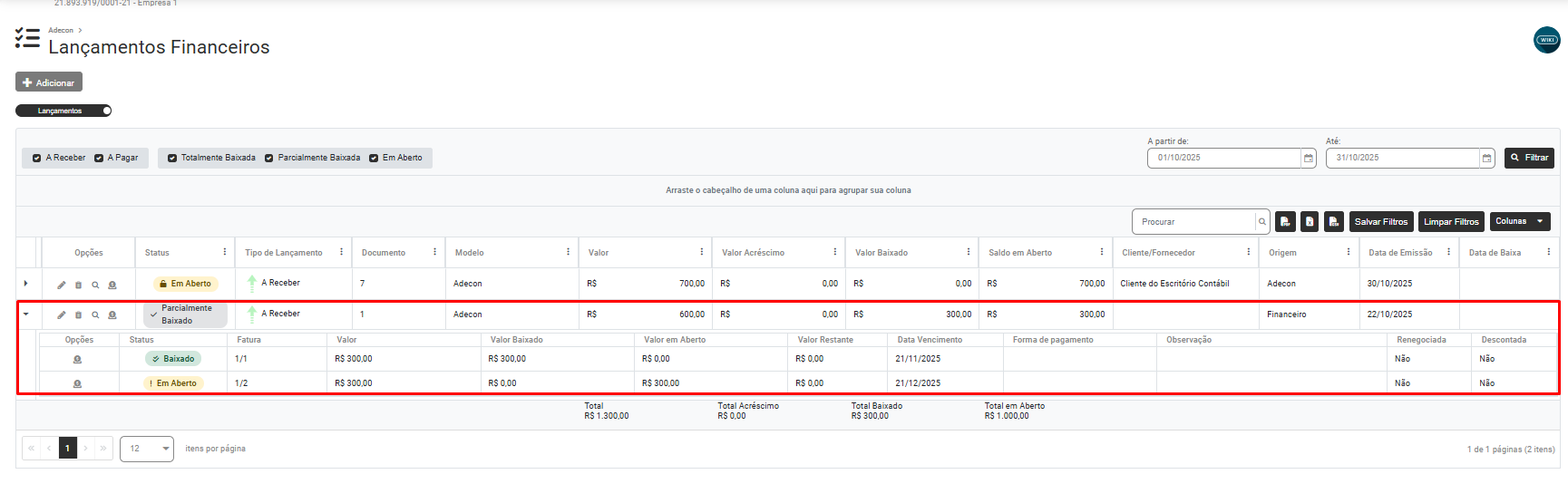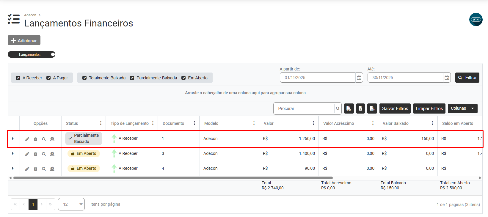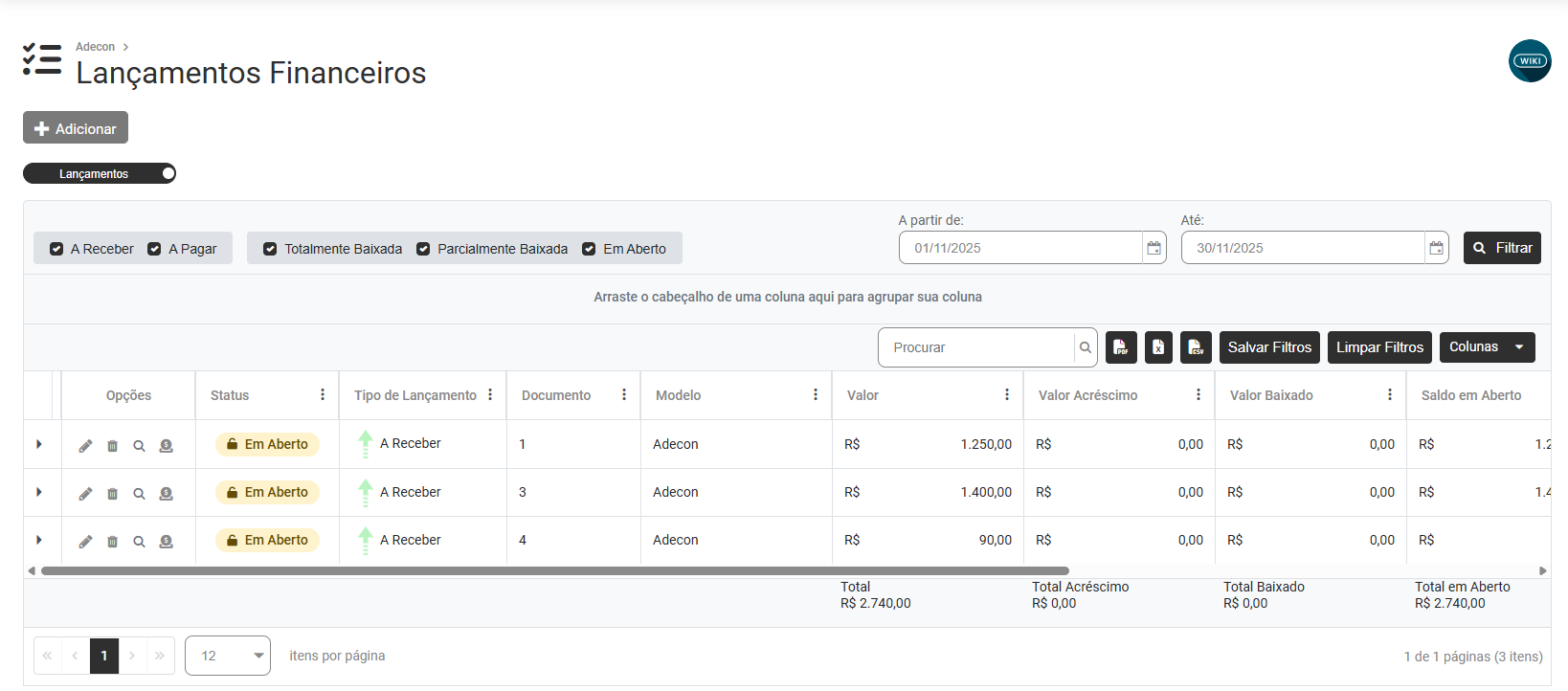 - Saldo em Aberto (R$) - O saldo é o resultado do valor do documento somando os acréscimos e subtraindo as baixas lançadas em sua movimentação.