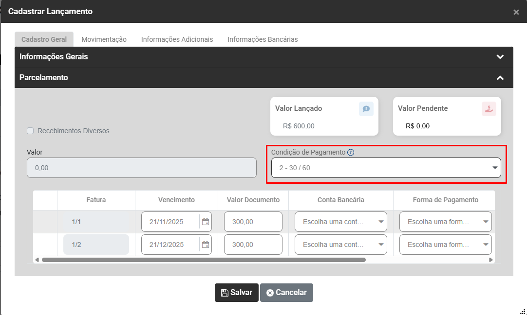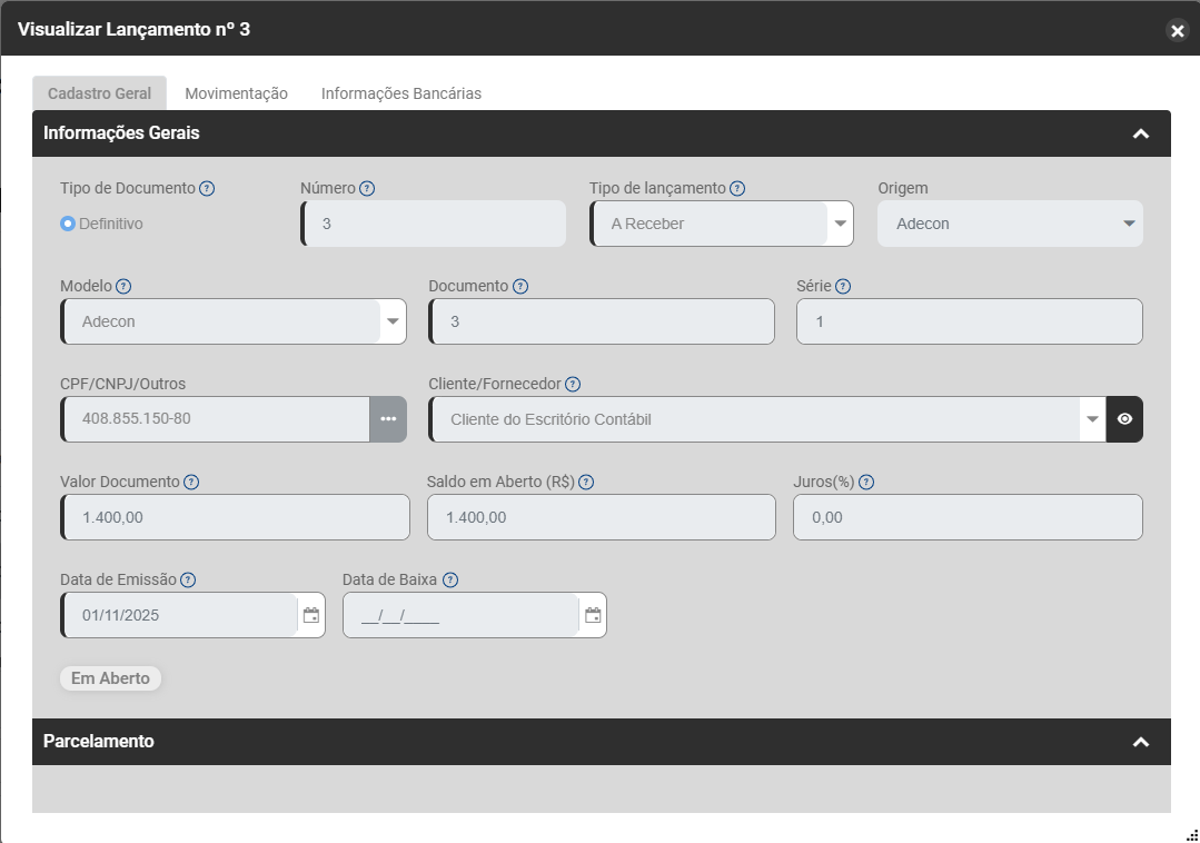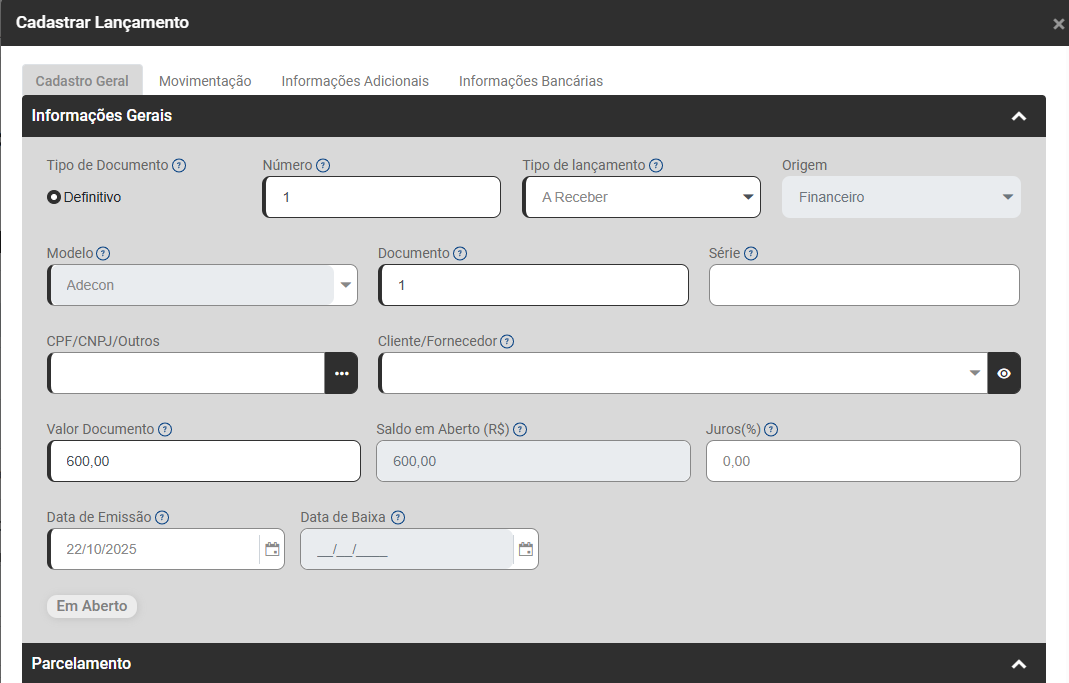 No campo Parcelamento você conseguirá definir se o Lançamento que está sendo cadastrado será parcelado