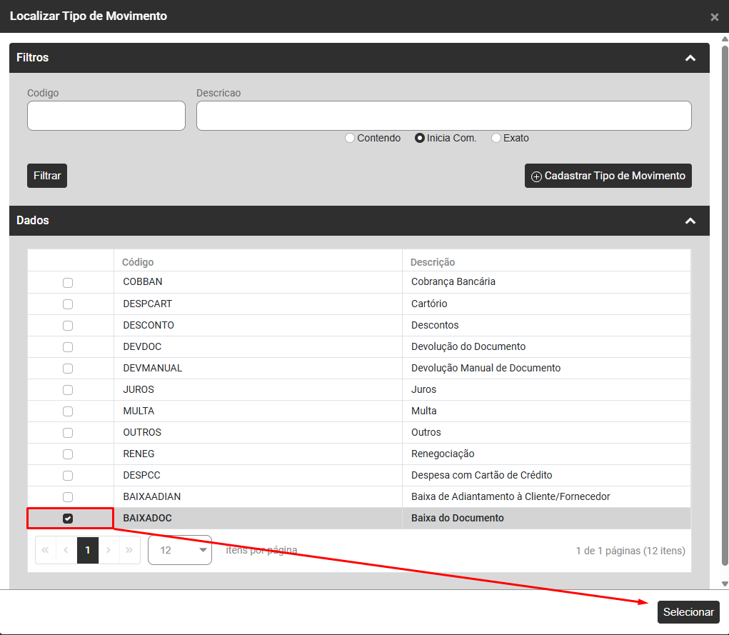 Pesquise pela Movimentação, faça a definição da mesma e clique em Selecionar