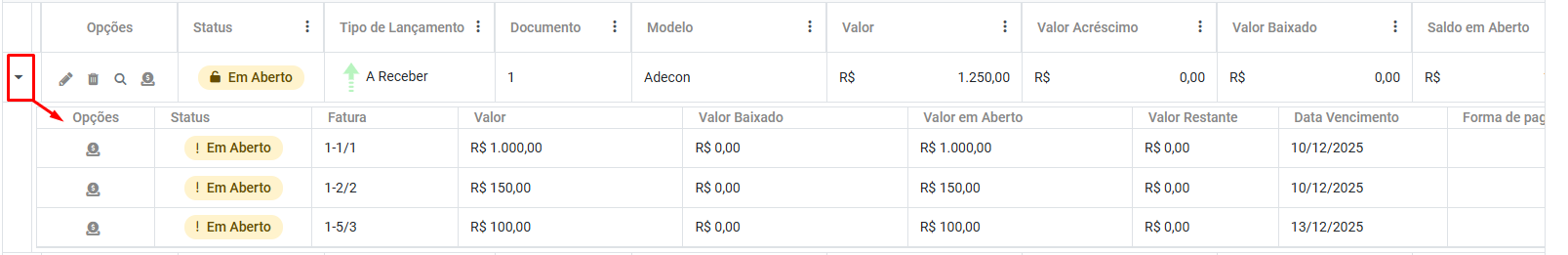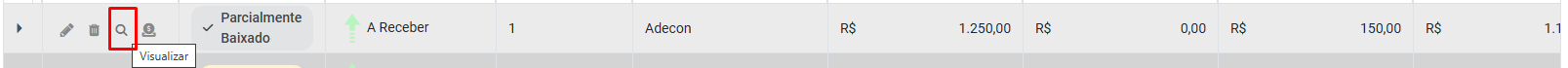 1) Expandir as informações - Quando esse botão é acionado o Sistema desmembra o total do Lançamento Financeiro