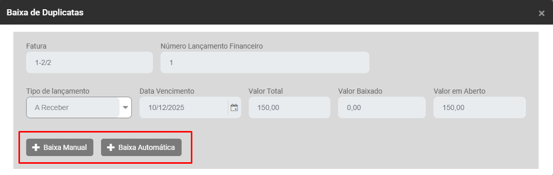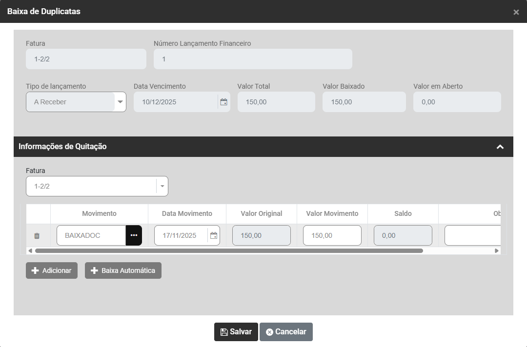 2) Baixar Duplicatas - Ao clicar no botão o Sistema apresentará a tela pra que você realize a baixa da duplicata selecionada