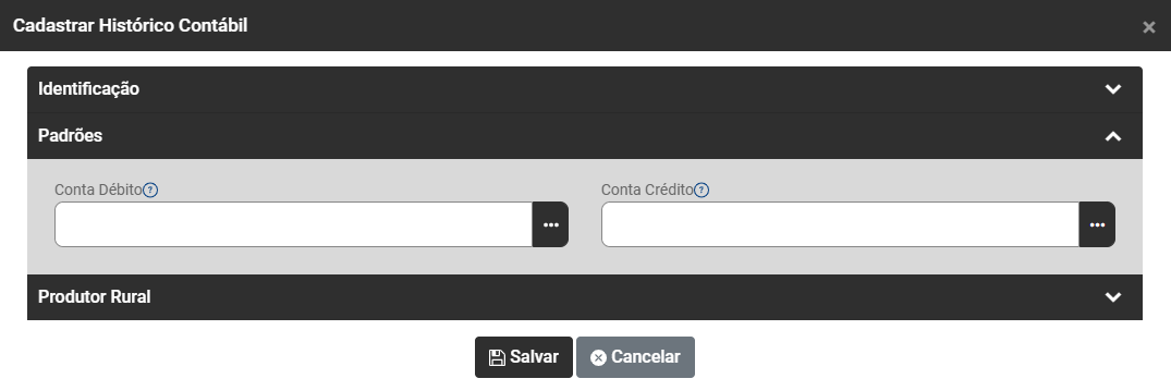 - Conta de Débito - Preencha uma Conta Contábil para levar automaticamente no lançamento contábil como débito ao incluir esse histórico.