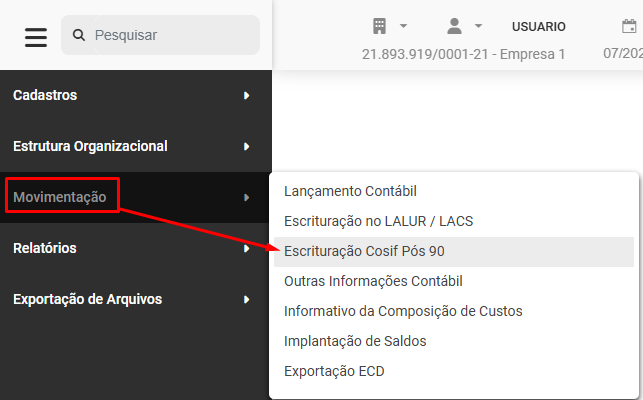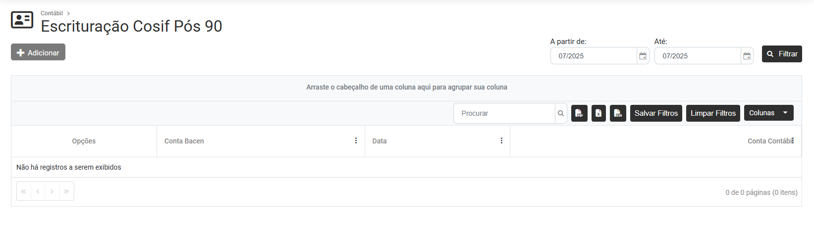 Para realizar a Escrituração COSIF Pós 90 acesse o menu Movimentação>Escrituração Cosif Pós 90