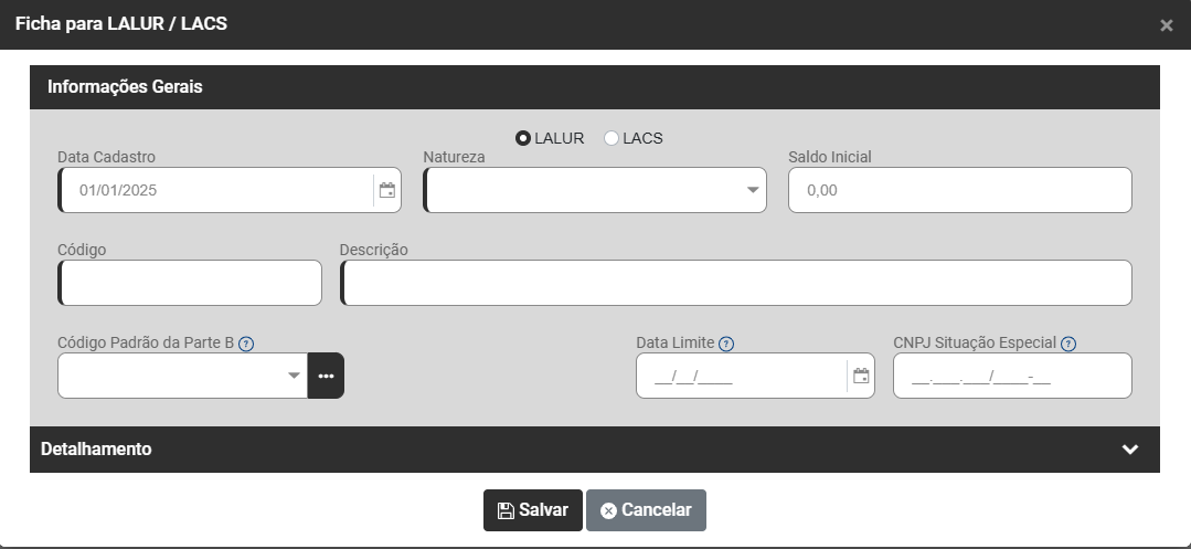 Ao acessar o botão Adicionar, o Sistema apresentará a tela para que você cadastre as informações da Escrituração do LALUR