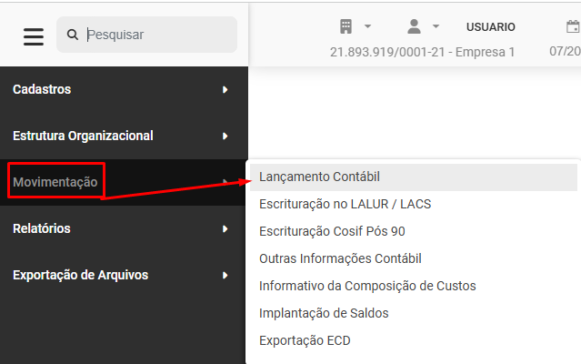Para que você realize o cadastro dos Lançamentos Contábeis da Empresa deverá acessar o menu Movimentação>Lançamento Contábil