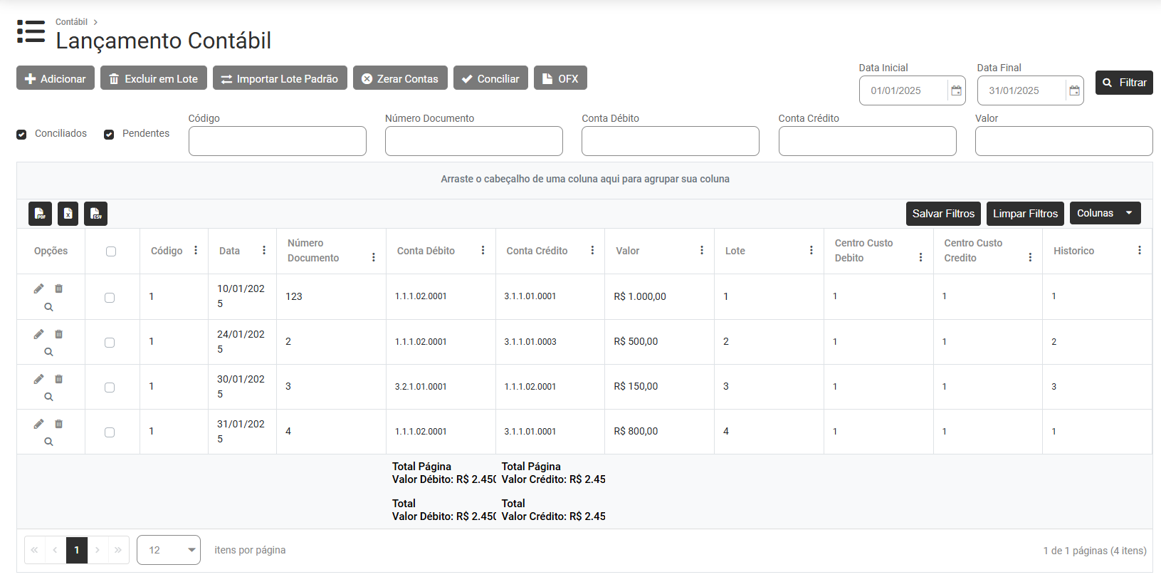 Na parte superior da tela você encontrará 6 botões - Adicionar, Excluir em Lote, Importar Lote Padrão, Zerar Contas, Conciliar e OFX
