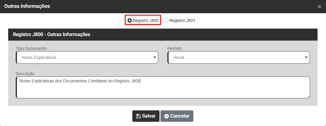 Ao acessar o botão Adicionar será apresentada a tela para cadastro das Outras Informações Contábeis, informe