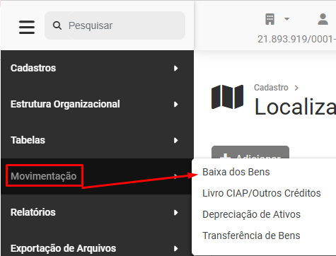 Para cadastrar a Baixa de um Bem acesse o menu Movimentação>Baixa dos Bens