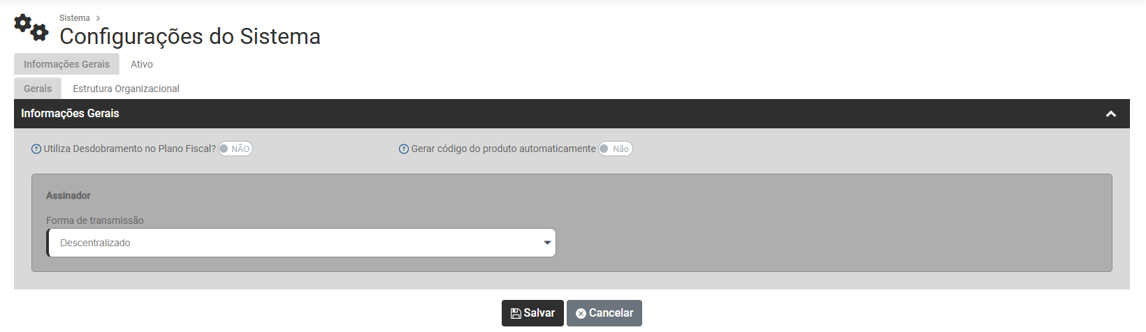 Cadastro das Configurações da Estrutura Organizacional e do Sistema Controle Patrimonial