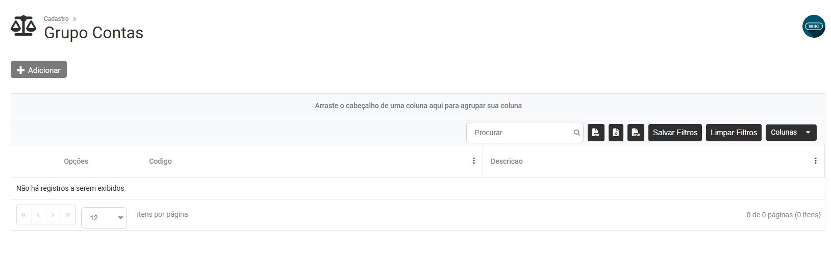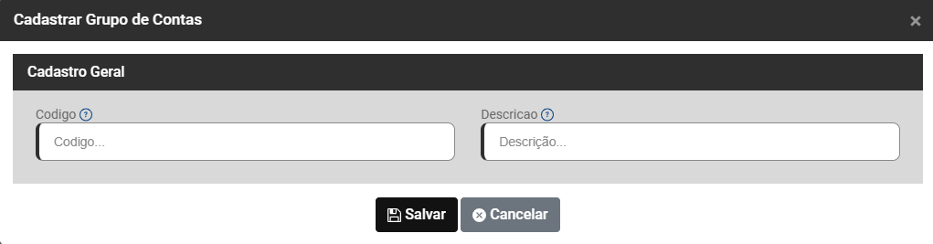 Ao clicar no botão Adicionar será apresentada a tela para Cadastrar os Grupos de Contas