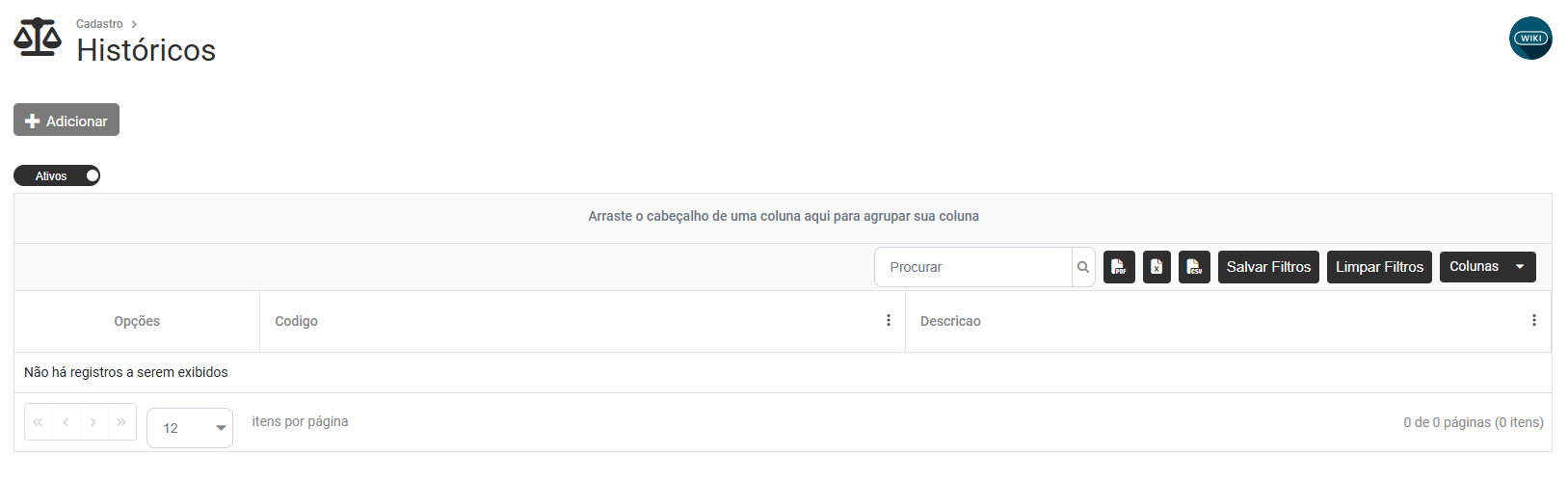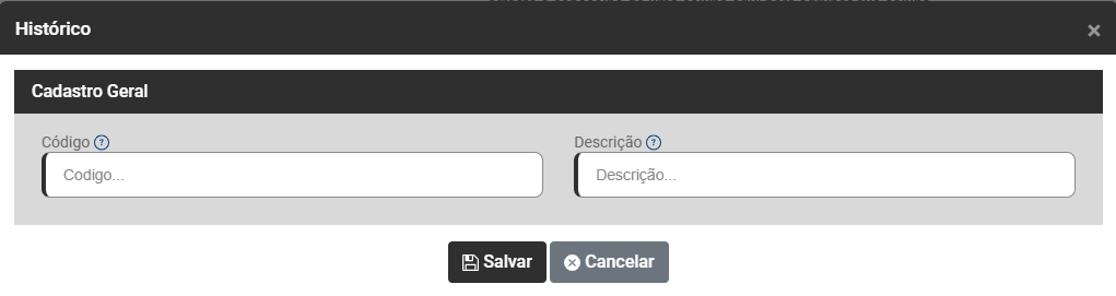 Ao clicar no botão Adicionar será apresentada a tela para Cadastro do Histórico