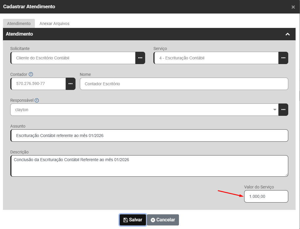 • Valor do Serviço - O Sistema trará o valor cadastrado para o Serviço e esse valor poderá ser alterado