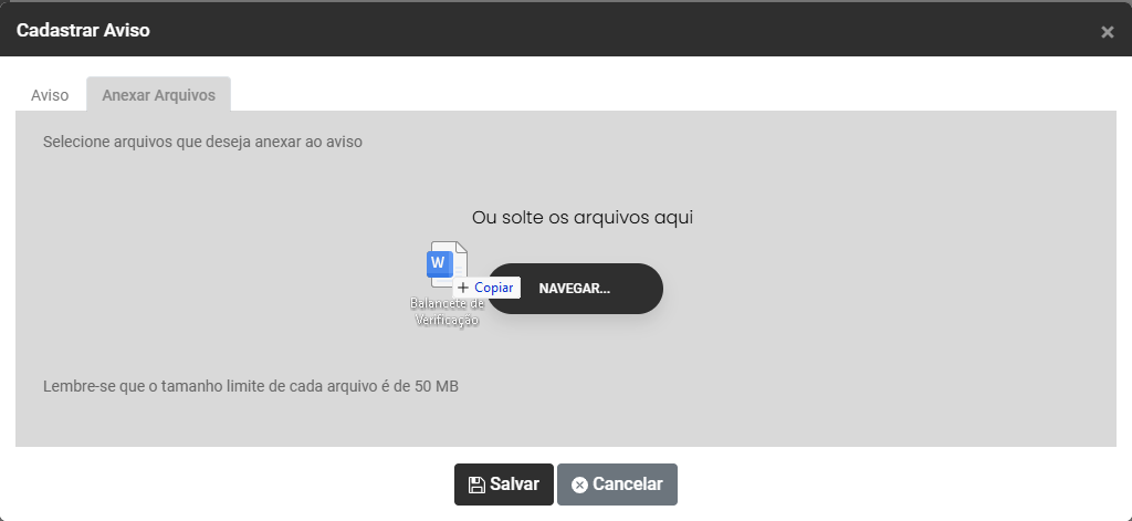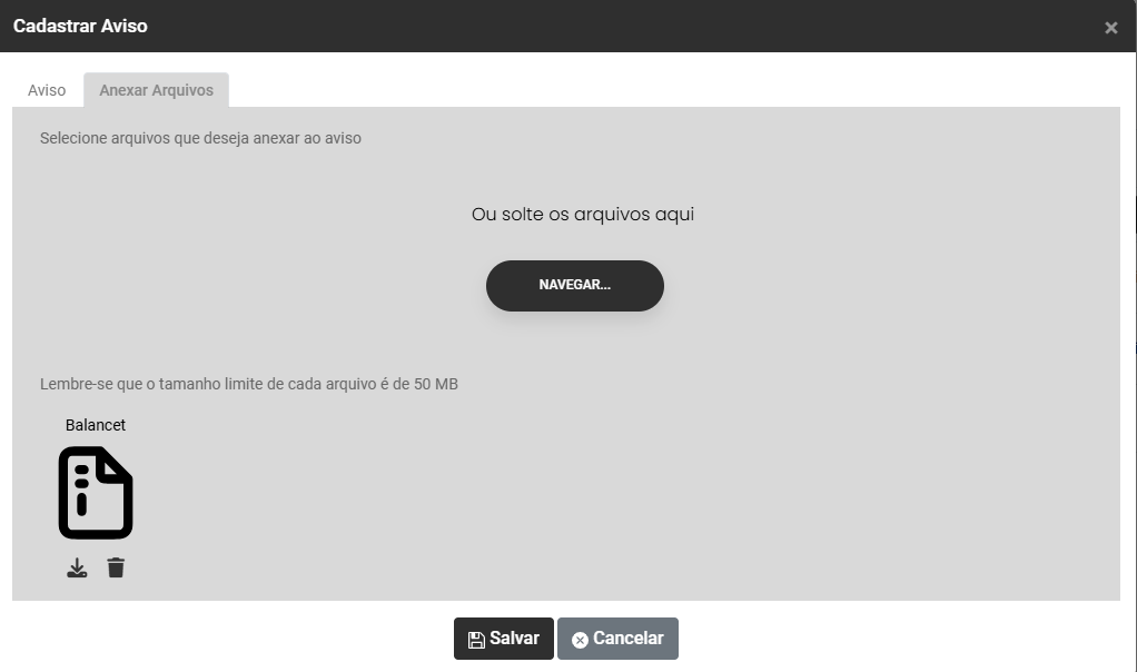 Ao acessar o botão Adicionar Avisos você encontrará duas abas - Aviso e Anexar Arquivos