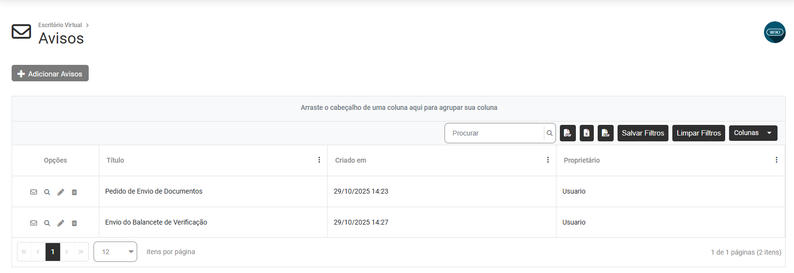 Na parte superior da tela você encontrará o botão Adicionar Avisos
