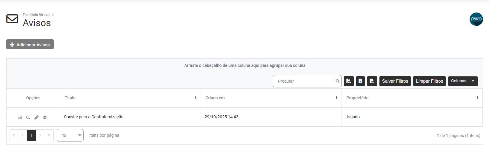 Na parte superior da tela você encontrará o botão Adicionar Avisos