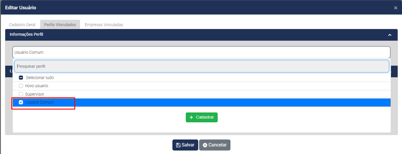 Aba Perfis Vinculados, defina o perfil