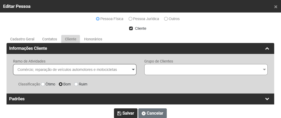 Ao clicar no botão Adicionar o Sistema apresentará a tela para Cadastrar Cliente, você deverá informar: