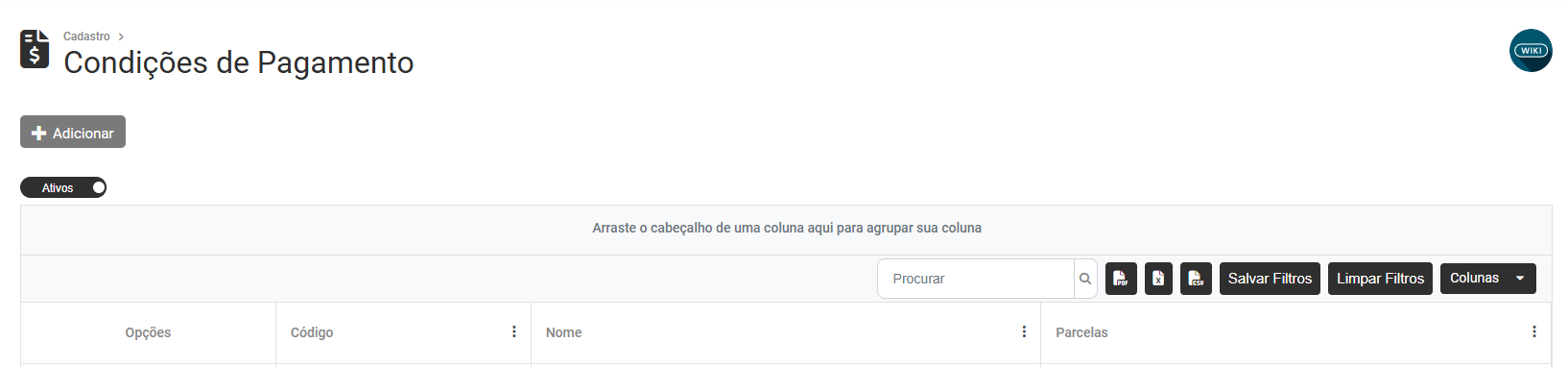 Ao acessar o botão Adicionar será apresentada a tela de Cadastro Geral da Condição de Pagamento