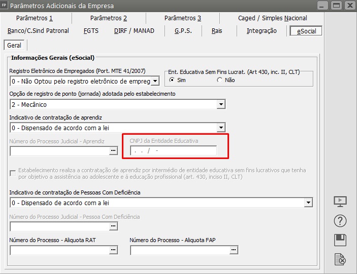 (art. 430, inciso II, da CLT), deverá informar o(s) número(s) de inscrição dessa(s) entidade(s) noe menuo Manutenção/Empresas/Parâmetros Adicionais da Empresa - aba eSocial, campo CNPJnome da Entidade Educativasem Fins Lucrativos