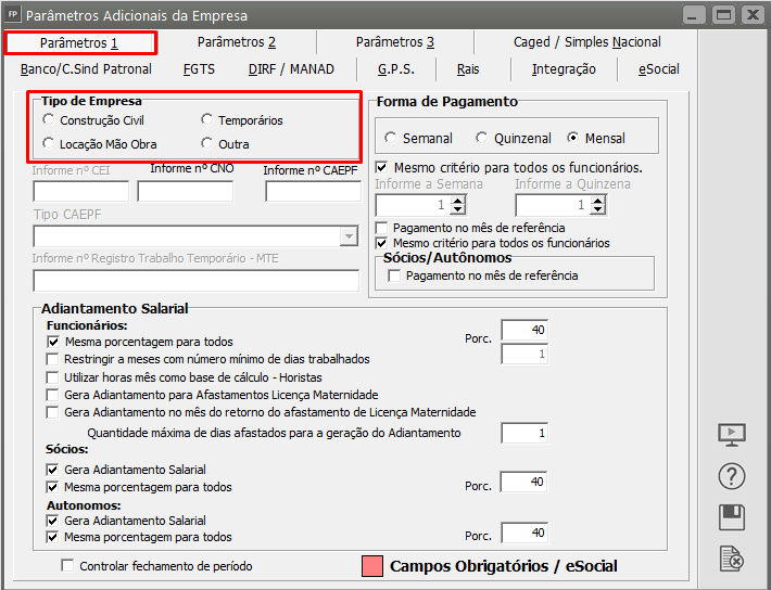 Acesse ‘Manutenção>Empresas>Parâmetros Adicionais da Empresa’ acesse na aba ‘Parâmetros 1’ e verifique o tipo da empresa: