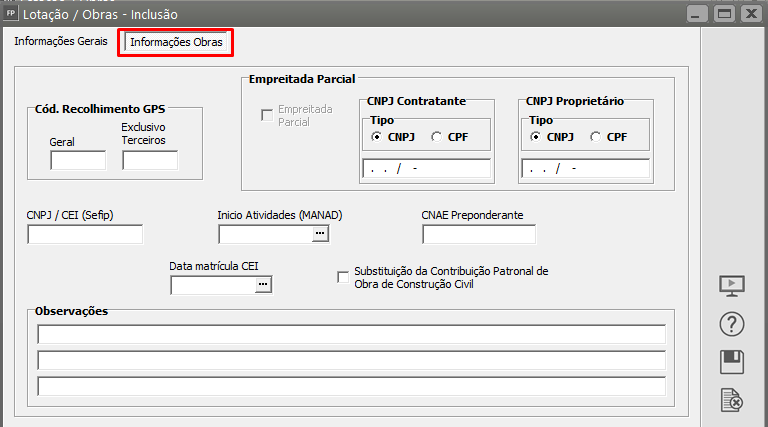 Obra → preencha corretamente todos os campos da aba 'Informações Obras':