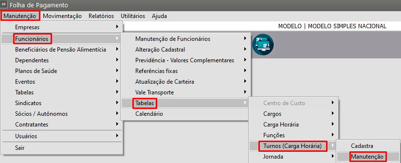 2. Acesse o menu ‘Manutenção>Funcionários>Tabelas>Jornada>Manutenção’ e cadastre a jornada.