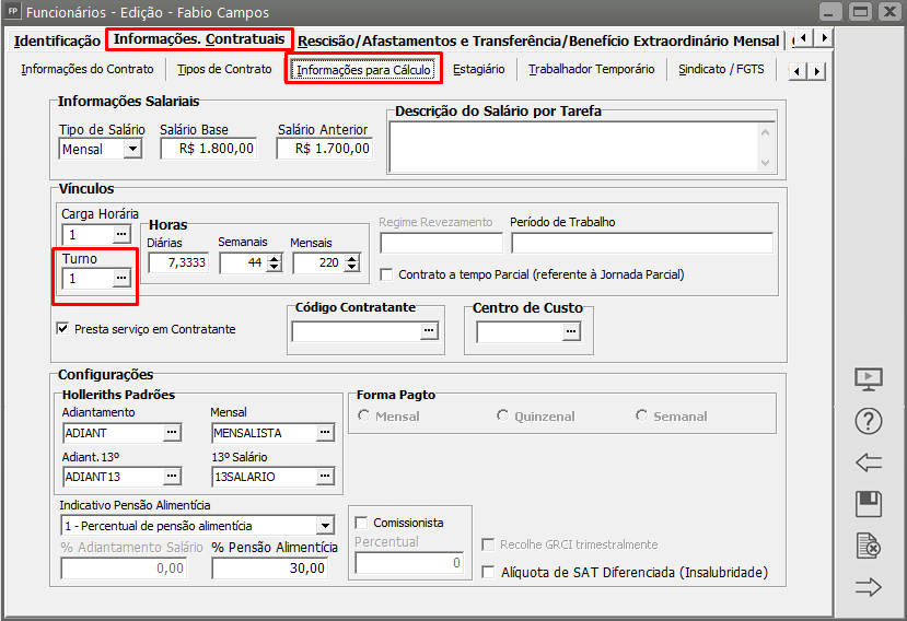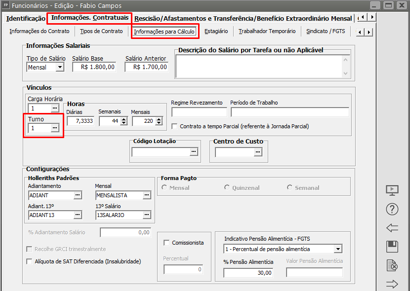 1. Acesse o cadastro do funcionário na aba 'Informações Contratuais>Informações para Cálculo' e verifique o turno informado: