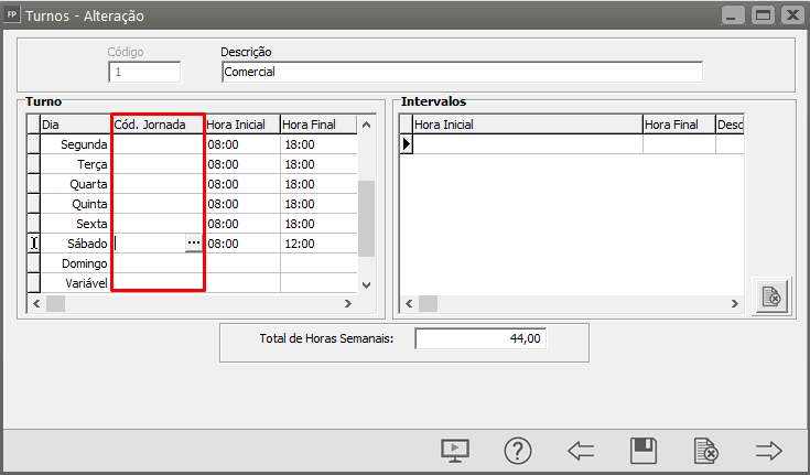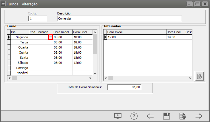 Caso o campo 'Cód. Jornada' esteja em branco mas tenha jornada cadastrada, dê dois cliques no campo 'Cód. Jornada'>clique nos três pontinhos>e selecione a jornada do seu funcionário para cada dia da semana em que ele trabalha. Se não tiver a jornada a cadastrada, ou, se ele fizer horários diferentes durante a semana, veja o próximo passo:
