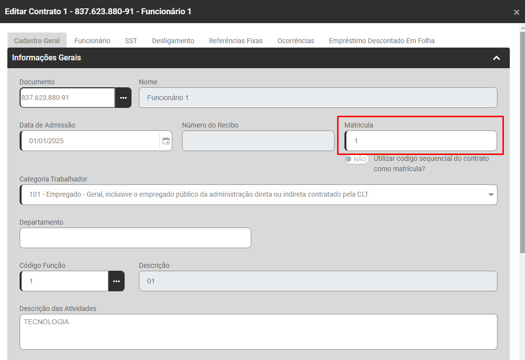 Solução: Alterar matrícula dentro do cadastro do funcionário