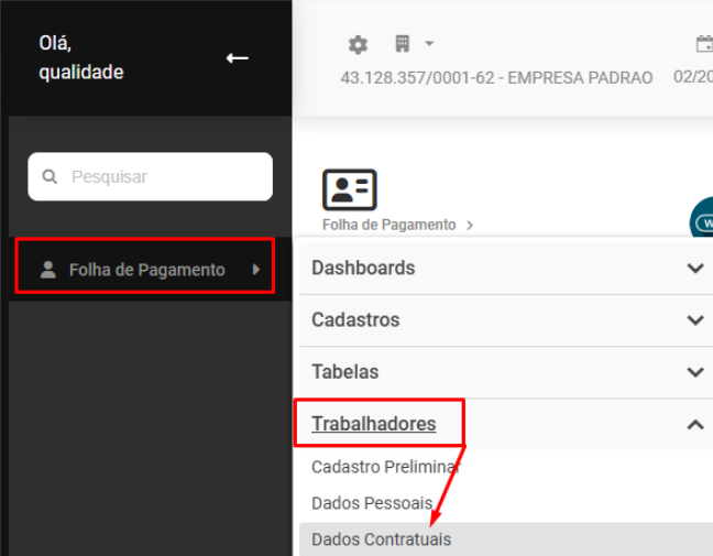 Em seguida acesse Folha de Pagamento>Trabalhador>Dados Contratuais