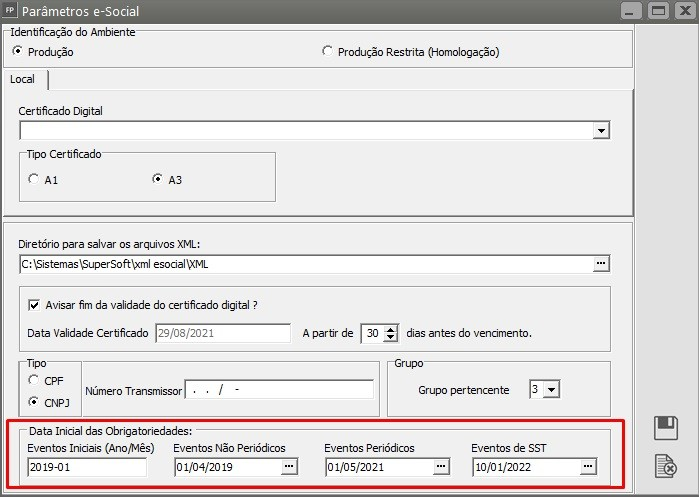Acesse no Sistema Folha de Pagamento, o menu Manutenção>Empresas>Parâmetros do eSocial confira as datas de obrigatoriedades informadas no campo Data Inicial das Obrigatoriedades.