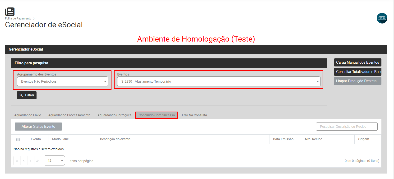 Filtre por Eventos Periódicos Não, evento s2230 - Concluído Com Sucesso