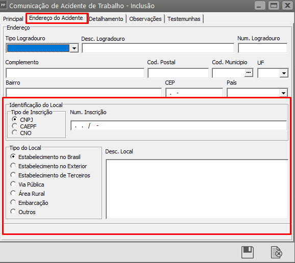 Como Corrigir: Acessar o menu Movimentação > CAT Geração > Manutenção e verificar na aba "Endereço do Acidente" se foi preenchido corretamente os dados do local do acidente.