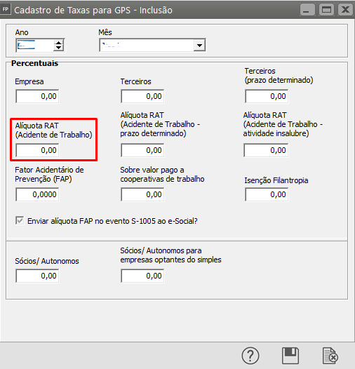 Após realizar o preenchimento, deverá acessar o menu: Manutenção > Tabelas > Impostos / Taxas e Contribuições > Taxa GPS > Manutenção e/ou Cadastra e verificar se a alíquota RAT foi preenchida no período desejado e se a mesma está coerente com o CNAE da empresa.