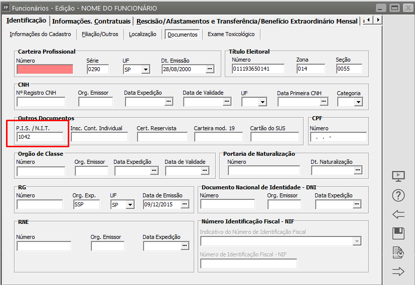 Editar o cadastro do funcionário e acessar a aba Identificação, sub aba Documentos e corrigir a informação cadastrada no campo PIS/NIT